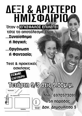 Ομιλία με θέμα το «Δεξί και Αριστερό Ημισφαίριο» διοργανώνει η πολιτιστική και καλλιτεχνική κίνηση «9 Μούσες».