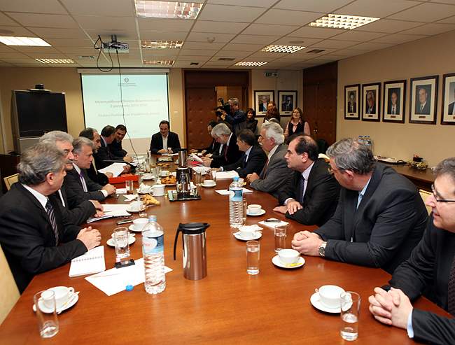 Τα οικονομικά προβλήματα που αντιμετωπίζουν οι 13 Περιφέρειες στα πρώτα βήματα εφαρμογής του «Καλλικράτη» συζητήθηκαν στη συνάντηση των 13 Περιφερειαρχών με τον Υπουργό Οικονομικών Γιώργο Παπακωνσταντίνου, τον Υφυπουργό Φίλιππο Σαχινίδη και το Γενικό Γραμματέα του Υπουργείου Ηλία Πλασκοβίτη.