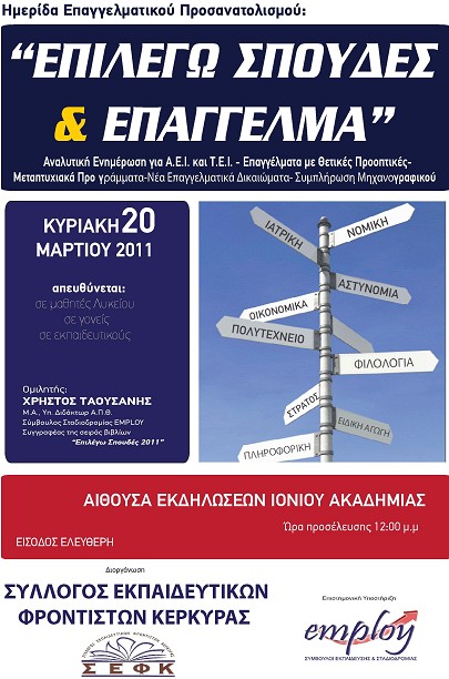 Ανοιχτή ενημερωτική εκδήλωση επαγγελματικού προσανατολισμού για όλους τους μαθητές, γονείς και εκπαιδευτικούς, διοργανώνει ο Σύλλογος Εκπαιδευτικών Φροντιστών Κέρκυρας, τη Κυριακή 20 Μαρτίου 2011, στην αίθουσα εκδηλώσεων της Ιονίου Ακαδημίας (πάνω πλατεία) και ώρα 12:00 το μεσημέρι, με θέμα