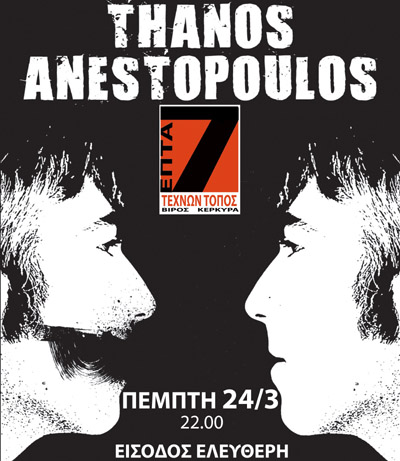Την Πέμπτη 24 Μαρτίου, στις 10 το βράδυ θα ξεκινήσει η συναυλία του Θάνου Ανεστόπουλου (Διάφανα Κρίνα) στο ΕΠΤΑ Τεχνών Τόπο, με ελεύθερη είσοδο.