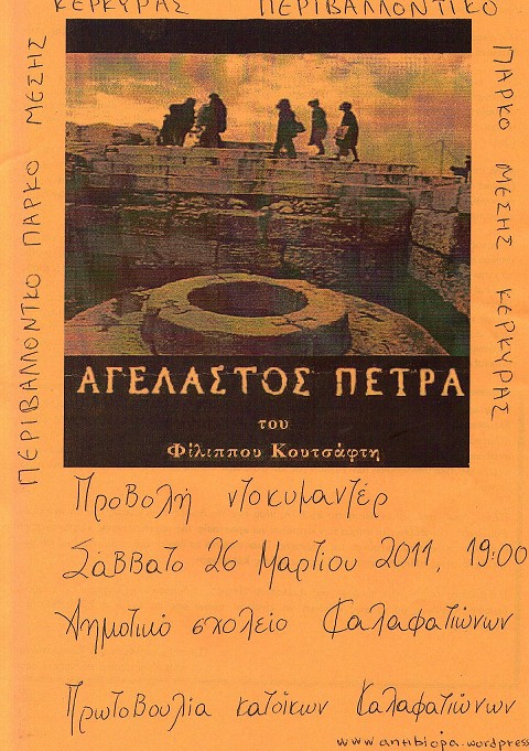 Η Πρωτοβουλία Κατοίκων Καλαφατιώνων θα προβάλει το Σάββατο 26 Μαρτίου (7μ.μ.) στο Δημοτικό Σχολείο της περιοχής το ντοκιμαντέρ «Αγέλαστος Πέτρα» του Φίλιππου Κουτσάφτη.