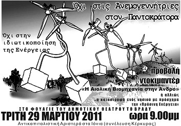 Η Αντικαπιταλιστική Αριστερά στα Ιόνια θα προχωρήσει στην προβολή του ντοκιμαντέρ "Η Αιολική Βιομηχανία στην Άνδρο" που όπως αναφέρει το δελτίο τύπου εξιστορεί…την καταστροφή ενος νησιού με πρόσχημα τη Πράσινη Ανάπτυξη.