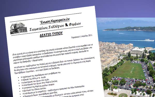 Στη δημιουργία Ένωσης Κερκυραϊκών Σωματείων, Συλλόγων & Φορέων προχώρησαν πολλά πρωτοβάθμια σωματεία και σύλλογοι επαγγελματιών της Κέρκυρας, με στόχο να προχωρήσουν σε δυναμικές δράσεις και διεκδικήσεις για τις «ανοικτές πληγές» της πόλης και του νησιού γενικότερα. Έτσι, 15 σωματεία εξέδωσαν κοινή διακήρυξη – διαμαρτυρία για «ενεργή δράση και διεκδίκηση» ζητημάτων από το ΦΠΑ μέχρι το οδικό δίκτυο και την αναβάθμιση των τουριστικών και άλλων υποδομών μέχρι τη διαχείριση των απορριμμάτων.