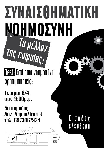 Η Πολιτιστική & Καλλιτεχνική Κίνηση «9 Μούσες» την Τετάρτη 6 Απριλίου (21.00) θα πραγματοποιήσει ομιλία με θέμα: "Συναισθηματική Νοημοσύνη".