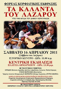 Ο Φορέας Κορφιάτικης Έκφρασης το Σάββατο 16 Απριλίου, από τις 11,00 το πρωί, στο ιστορικό κέντρο της πόλης μας , διοργανώνει υπο την αιγίδα του Δήμου Κερκυραίων, τα "Κάλαντα του Λαζάρου", με την συμμετοχή των χορωδιών: Βαλανιού, Αχαράβης, Αχιλλείου "Δημόδοκος", παιδικής Κέρκυρας, σύνολο μαντολίνων "Μενεστρέλοι", Σύνολο πνευστών Φ.Ε. "Μάτζαρος", και φιλαρμονικής Κορακιάνας "Σπύρος Σαμάρας".