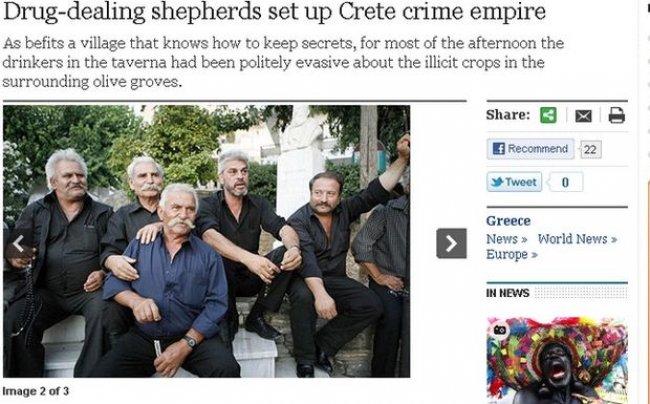 Όπως τονίζεται, το δημοσίευμα είναι διάσπαρτο από αναφορές του τύπου: « Ελληνική Κολομβία στα βουνά της οποίας λαμβάνουν σκηνές αγριότητας μεταξύ συμμοριών, εμπόρων ναρκωτικών και Ελληνικής Αστυνομίας», «ασυδοσία συμμοριών», «Οι εγκέφαλοι των συμμοριών είναι ακόμα εδώ, Κρήτη ίσον Σικελία του Νονού», «οι βαρόνοι των ναρκωτικών», «το αντριλίκι περισσεύει, αφού δεν πρόκειται απλά για τη γαζωμένη με σφαίρες ταμπέλα του χωριού, πράγμα σύνηθες για ένα νησί, στο οποίο ο ένας στους τρεις οπλοφορεί».