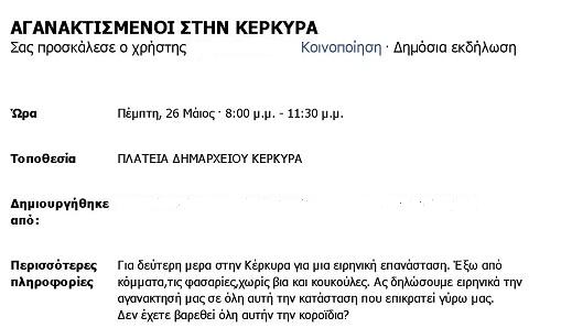 Κάλεσμα για μια δεύτερη συνεχόμενη ειρηνική συγκέντρωση διαμαρτυρίας στην Πλατεία Δημαρχείου εξέδωσαν οι διαχειριστές του γκρουπ «αγανακτισμένοι στην Κέρκυρα» στο facebook. Η σημερινή συγκέντρωση είναι προγραμματισμένη για τις 8 το απόγευμα.