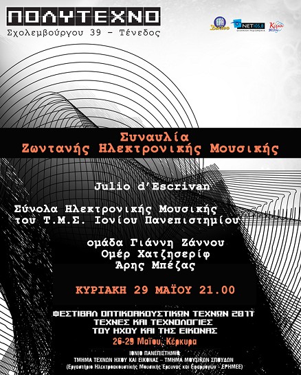 Στην συναυλία θα συμμετάσχουν ο Julio d’Escrivan (καθηγητής Μουσικής Τεχνολογίας στο Anglia Ruskin University, Cambridge, Αγγλία) σε μια παρουσίαση live coding, η ομάδα του καθηγητή Τ.Μ.Σ. και Τ.Τ.Η.Ε. του Ιόνιου Πανεπιστήμιου Γιάννη Ζάννου με την συμμετοχή των Ομέρ Χατζησερίφ και Άρη Μπέζα καθώς και τα Σύνολα Ηλεκτρονικής Μουσικής του Τ.Μ.Σ. Ιονίου Πανεπιστημίου (Ανδρέας Μνιέστρης, Θεόδωρος Λώτης, Φίλιππος Θεοχαρίδης και φοιτητές).