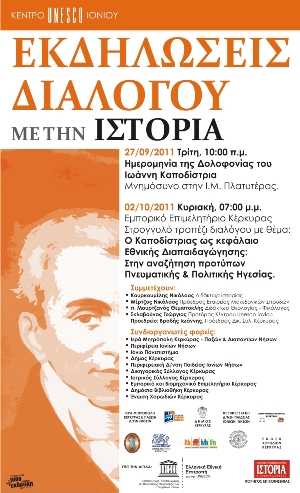 Το Κέντρο Unesco Ιονίου θα διοργανώσει δύο «εκδηλώσεις διαλόγου με την ιστορία». Συγκεκριμένα, την Τρίτη 27 Σεπτεμβρίου, ημερομηνία της δολοφονίας του Ιωάννη Καποδίστρια, θα πραγματοποιήσει μνημόσυνο στην Ιερά Μητρόπολη Πλατυτέρας, στη μνήμη του πρώτου κυβερνήτη της Ελλάδας, ενώ την Κυριακή 2 Οκτωβρίου, στις 7 το απόγευμα, στο Εμπορικό Επιμελητήριο θα διεξάγει στρογγυλό τραπέζι διαλόγου με θέμα «Ο Καποδίστριας ως κεφάλαιο Εθνικής Διαπαιδαγώγησης: Στην αναζήτηση πολιτικών προτύπων Πνευματικής & Πολιτικής Ηγεσίας».