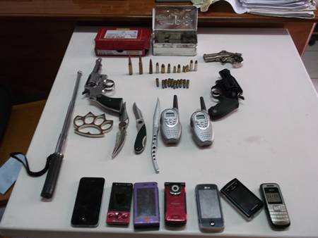 έρευνα που διενεργήθηκε στην οικία τους, παρουσία δικαστικού λειτουργού, βρέθηκαν και κατασχέθηκαν δύο περίστροφα, ένα πιστόλι, φυσίγγια, μαχαίρια – σουγιάδες, διαρρηκτικά εργαλεία και πλήθος κλεμμένων αντικειμένων όπως ηλεκτρολογικός- μηχανολογικός εξοπλισμός, καθώς και όργανα γυμναστικής και διάφορα εργαλεία.