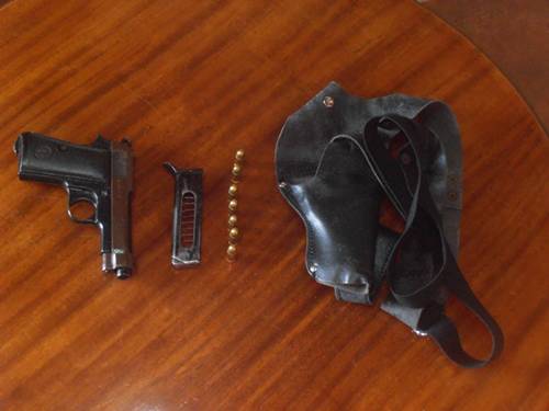 Σε σωματική έρευνα που ακολούθησε βρέθηκε στην κατοχή του, εντός θήκης μασχάλης ένα πιστόλι BERRETA, διαμετρήματος 9mm, οπλισμένο και με άλλες έξι σφαίρες στη γεμιστήρα του.