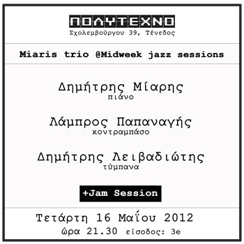 Την Τετάρτη 16 Μαίου, το Miaris trio σε bebop διάθεση, με συνθέσεις των μεγιστάνων της jazz Bud Powell, Dizzy Gillespie, Thelonious Monk, κ.α.