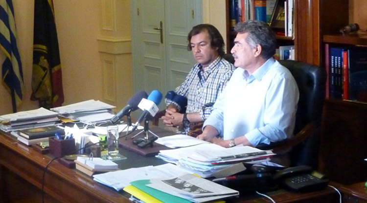 Στη φωτογραφία ο Δήμαρχος Κώστας Νικολούζος (A) με τον έως πρότινος αντιδήμαρχο Πολιτισμού Μάνο Ράπτη (Δ) τον Ιούλιο του 2016 σε κοινή συνέντευξη τύπου. Ο κ. Ράπτης μένει εκτός ανασχηματισμού και ο τομέας του Πολιτισμού, προφανώς, πηγαίνει απευθείας στην ευθύνη του Δημάρχου.