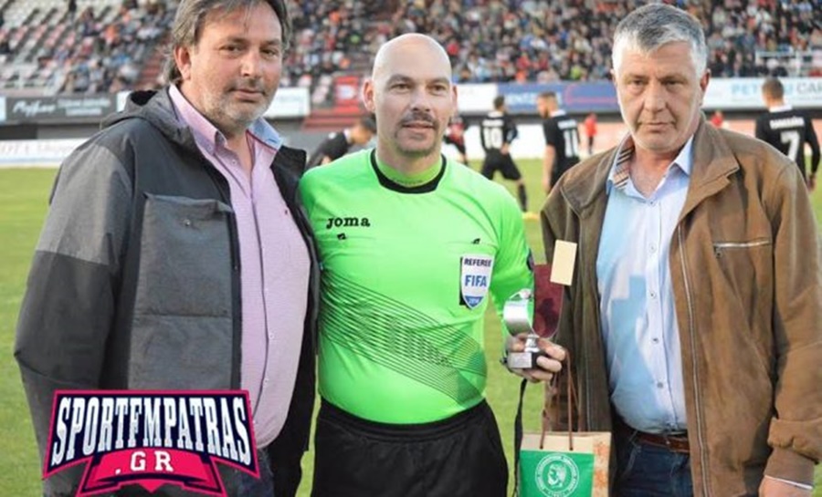 Με τον Κερκυραίο πρώην διεθνή ρέφερι, μάλιστα, να βραβεύεται από τον Πρόεδρο της ΕΠΣ Αχαϊας, Άγγελο Δανιήλ και τον αρχηδιαιτητή Τάκη Ανδριόπουλο, λίγο πριν την έναρξη του δεύτερου μέρους του αγώνα-φιέστα.
