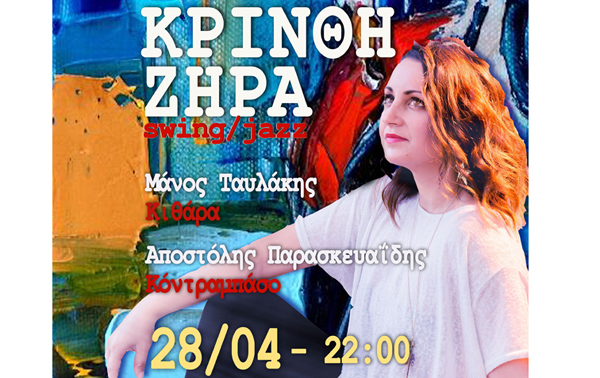 Πρόκειται για μια μοναδική ερμηνεύτρια που εδώ και χρόνια έχει κάνει το όνομα της γνωστό στον πολιτιστικό χάρτη της Κέρκυρας, αλλά και εκτός αυτού. Η Κρίνθη Ζήρα θα παρουσιάσει ένα ζωντανό πρόγραμμα με κλασσικά ελληνικά τραγούδια σε swing / jazz διάθεση, με την συνοδεία του Μάνου Ταυλάκη στην κιθάρα και του Απόστολου ΠαρασκευαΪδη στο κοντραμπάσο.