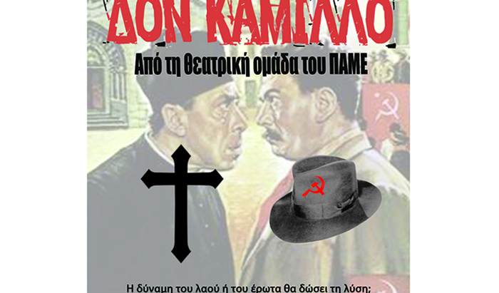 Η Θεατρική Ομάδα της Πολιτιστικής Ομάδας του ΠΑΜΕ παρουσιάζει το θεατρικό έργο «ΔΟΝ ΚΑΜΙΛΛΟ» του Σωτήρη Πατατζή το Σάββατο 3 και την Κυριακή 4 Ιουνίου στο Δημοτικό Θέατρο (Μικρή Σκηνή).