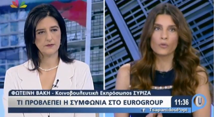 Τέλος, απαντώντας στις επικρίσεις της ΝΔ η Φ. Βάκη αναρωτήθηκε «ποια ήταν η δική τους διαπραγματευτική επιτυχία; Το “forget it Yiannis” ή το success story του κ. Σαμαρά με εσωτερική υποτίμηση και απώλεια 25% του εθνικού πλούτου;». «To χρέος και την είσοδο της χώρας στα μνημόνια δεν τα δημιούργησε αυτή η κυβέρνηση, που παρέλαβε μία ευρωπαϊκή χώρα η οποία τελούσε σε ανθρωπιστική κρίση» κατέληξε.