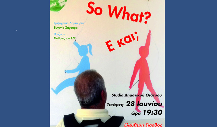 Το Δημοτικό Περιφερειακό Θέατρο Κέρκυρας σε συνεργασία με το Σχολείο Δεύτερης Ευκαιρίας Κέρκυρας παρουσιάζει την θεατρική παράσταση: SO WHAT? Ε και; Τετάρτη 28 Ιουνίου, ώρα 19:30, Studio Δημοτικού Θεάτρου με ελεύθερη είσοδο.