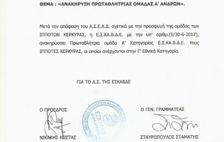«Μετά την απόφαση του ΑΣΕΑΔ σχετικά με την προσφυγή της ομάδας των Ιπποτών Κέρκυρας, η ΕΣΚΑΒΔΕ με την υπ’ αριθμ. (5/30-6-2017), ανακηρύσσει Πρωταθλήτρια Ομάδα Α’ κατηγορίας ΕΣΚΑΒΔΕ τους Ιππότες Κέρκυρας, οι οποίοι ανέρχονται στην Γ’ Εθνική Κατηγορία».