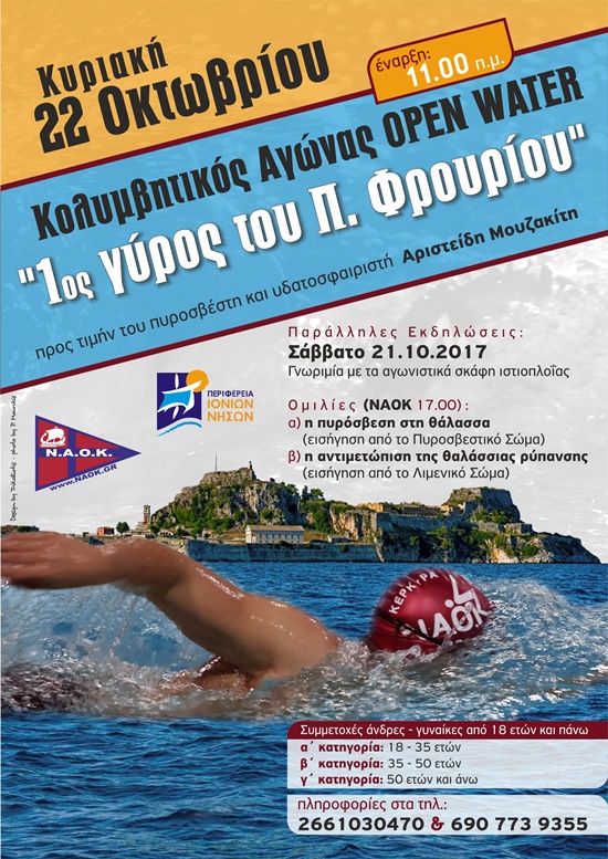 Σε αυτό το πλαίσιο εντάσεται η διοργάνωση του κολυμβητικού αγώνα OPEN WATER «1ος Γύρος του Παλαιού Φρουρίου» την Κυριακή 22/10/17, με σκοπό να τιμηθεί η μνήμη του πυροσβέστη και αθλητή – υδατοσφαιριστή του Ν.Α.Ο.Κ. Αριστείδη Μουζακίτη. Με αφορμή αυτό το γεγονός έχουν προετοιμαστεί για το Σάββατο 21/10/17 [17.30] στο χώρο του Ομίλου παράλληλες εκδηλώσεις που περιέχουν γνωριμία με τους τύπους των ιστιοπλοϊκών σκαφών αλλά και δύο εδιαφέρουσες διαλέξεις με θέματα: «Η πυρόσβεση στη θάλασσα» και «Η αντιμετώπιση της θαλάσσιας ρύπανσης».