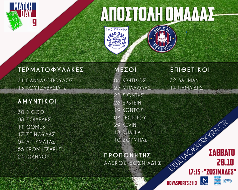 Μια αποστολή, από την οποία, απουσιάζει ο τραυματίας Ροτζέριο Τουράμ, κι η οποία απαρτίζεται από τους εξής: Γιαννακόπουλο, Κουτζαβασίλη, Ντιόγκο, Σοϊλέδη, Γκόμες, Σπίνουλα, Αρτυματά, Γρομητσάρη, Ιωάννου, Κρητικό, Μπαλάφα, Σιόντη, Επστάιν, Κόντο, Γεωργίου, Κέβιν, Ντουαλά, Ζορμπά, Μπάουμαν και Παμλίδη.