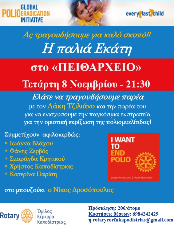 Μουσική βραδιά με αγαπημένους Κερκυραίους καλλιτέχνες διοργανώνει την Τετάρτη 8 Νοεμβρίου στο μουσικό μεζεδοπωλείο «Πειθαρχείο» ο Ροταριανός Όμιλος Κέρκυρα-Καποδίστριας για να ενισχύσει την παγκόσμια εκστρατεία για την οριστική εκρίζωση της πολιομυελίτιδας.