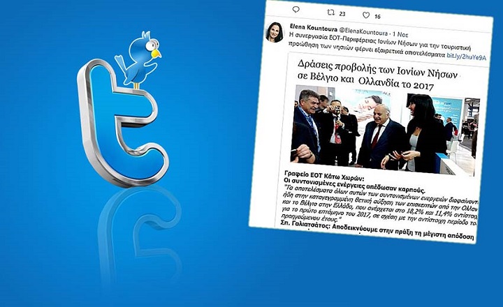 Η ανάρτηση της Υπουργού έρχεται σε συνέχεια της επιστολής της Προϊσταμένης του Γραφείου ΕΟΤ Κάτω Χωρών Ελένης Σκαρβέλη προς τον Αντιπεριφερειάρχη Τουρισμού Σπύρο Γαλιατσάτο και θέμα την αποτίμηση των ενεργειών προβολής έτους 2017 για τον προορισμό Ιόνια Νησιά.