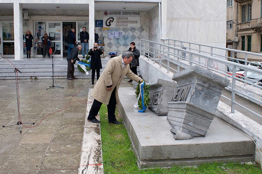 Στεφάνια κατέθεσαν ο Περιφερειάρχης Ιονίων Νήσων Θεόδωρος Γαλιατσάτος, ο βουλευτής Κώστας Παυλίδης, η Αντιπεριφερειάρχης ΠΕ Κέρκυρας Νικολέττα Πανδή, ο εκπρόσωπος του Δήμου Κέρκυρας αντιδήμαρχος Γιώργος – Ηλίας Παντελιός και ο Περιφερειακός Δ/ντης Εκπαίδευσης Κώστας Γκούσης.