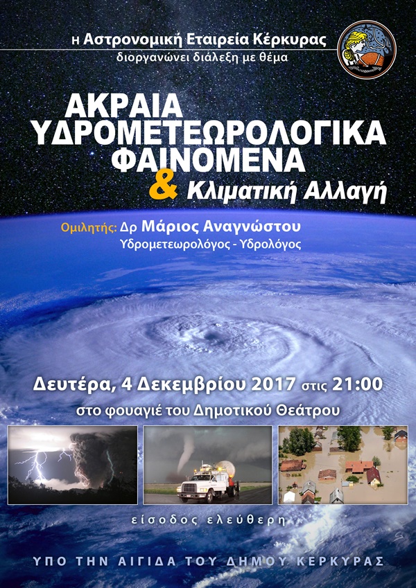 Η Αστρονομική Εταιρεία Κέρκυρας διοργανώνει διάλεξη με θέμα “ακραία υδρομετεωρολογικά φαινόμενα και κλιματική αλλαγή”.