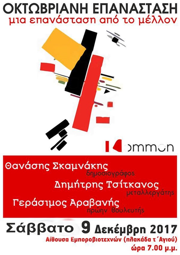 Το Σάββατο 9 Δεκεμβρίου, στις 7 το βράδυ, στην αίθουσα των Εμποροβιοτεχνών (Πλακάδα τ΄ Αγιού), το διαδικτυακό περιοδικό ΚΟΜΜΟΝ.GR οργανώνει εκδήλωση με θέμα την ΟΚΤΩΒΡΙΑΝΗ ΕΠΑΝΑΣΤΑΣΗ.