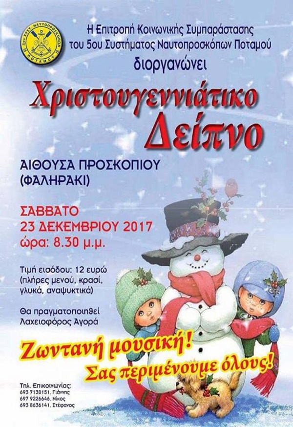 H Eπιτροπή Κοινωνικής Συμπαράστασης του 5ου Συστήματος Ναυτοπροσκόπων Ποταμού διοργανώνει Χριστουγεννιάτικο δείπνο, το Σάββατο 23 Δεκεμβρίου στην αίθουσα προσκοπείου στο Φαληράκι στις 20:30 με ζωντανή μουσική.