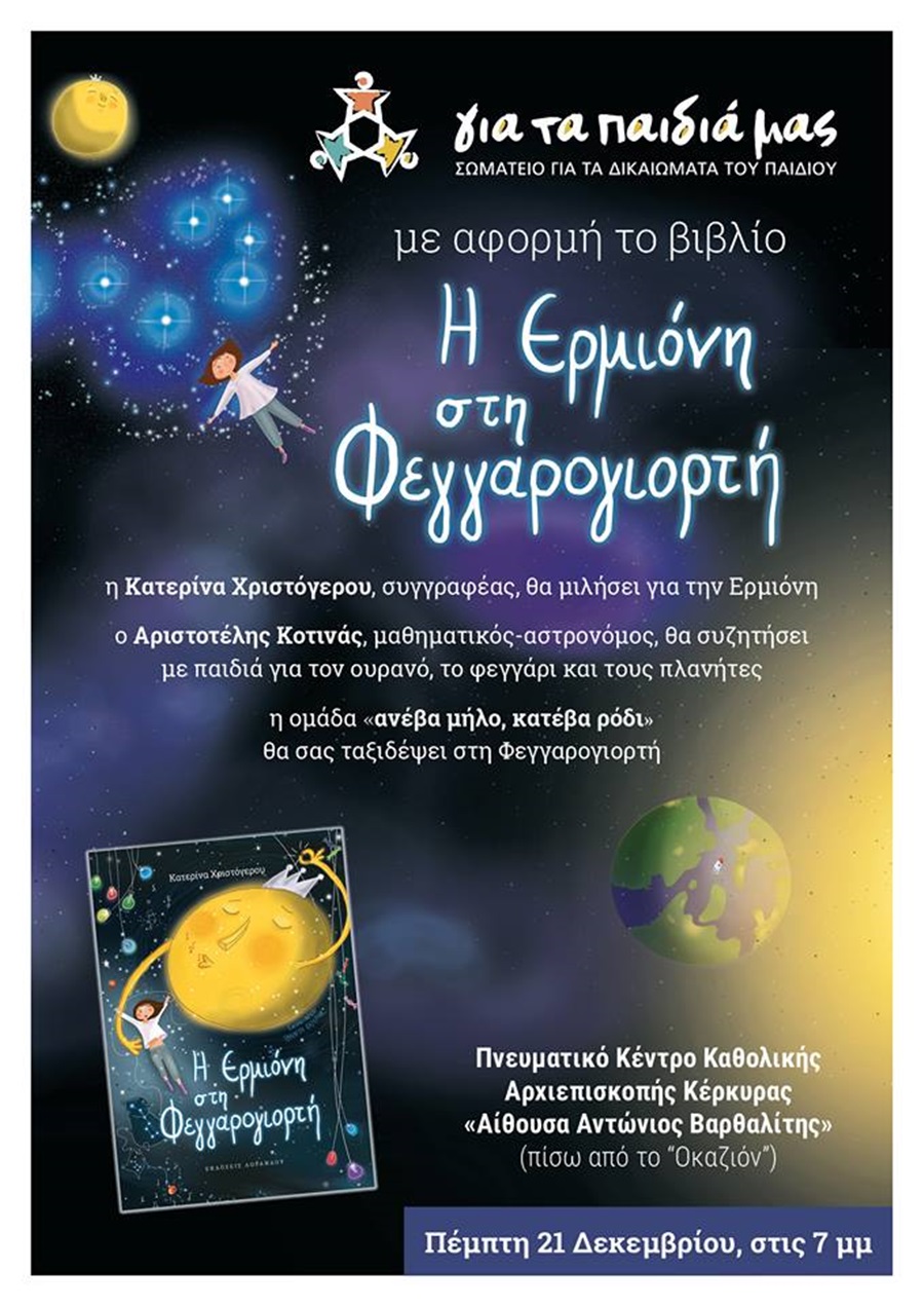 Mε αφορμή το βιβλίο «η Ερμιόνη στη Φεγγαρογιορτή»,το Σωματείο «για τα παιδιά μας» σας προσκαλεί σε γιορτινή εκδήλωση στο Πνευματικό Κέντρο της Καθολικής Αρχιεπισκοπής Κέρκυρας – «Αίθουσα Αντώνιος Βαρθαλίτης» (πίσω από το “Οκαζιόν”) την Πέμπτη 21 Δεκεμβρίου, στις 7 μμ.