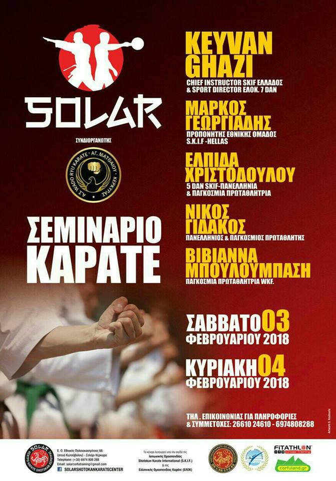 Ο αθλητικός σύλλογος SOLAR – Κέντρο καράτε Σότοκαν Κέρκυρας, διοργανώνει μεγάλο σεμινάριο Καράτε με εξέχοντες δασκάλους και αθλητές με πανευρωπαϊκούς και παγκόσμιους τίτλους. Συνδιοργανωτής ο αθλητικός σύλλογος Καράτε Αγ. Ματθαίου.