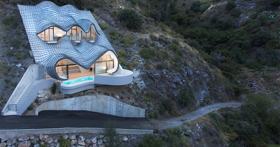 Η μορφή του σπιτιού και η μεταλλική οροφή παράγουν μια υπολογισμένη αισθητική ασάφεια ανάμεσα στο φυσικό και το τεχνητό, ανάμεσα στο δέρμα ενός δράκου στο έδαφος, όταν το βλέπουμε από κάτω και κυμάτων της θάλασσας, όταν το βλέπουμε από πάνω.