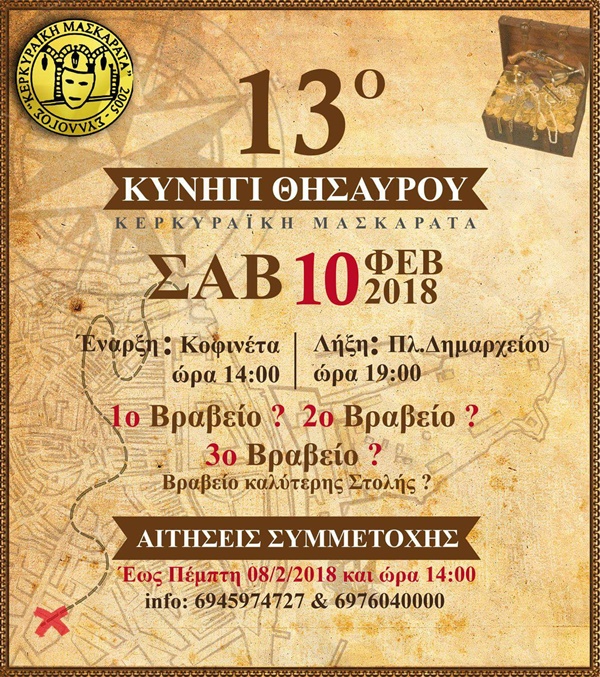Έρχεται το 13ο Κυνήγι Θυσαυρού από την Κερκυραϊκή Μασκαράτα στο κέντρο της πόλης, το Σάββατο 10 Φεβρουαρίου.