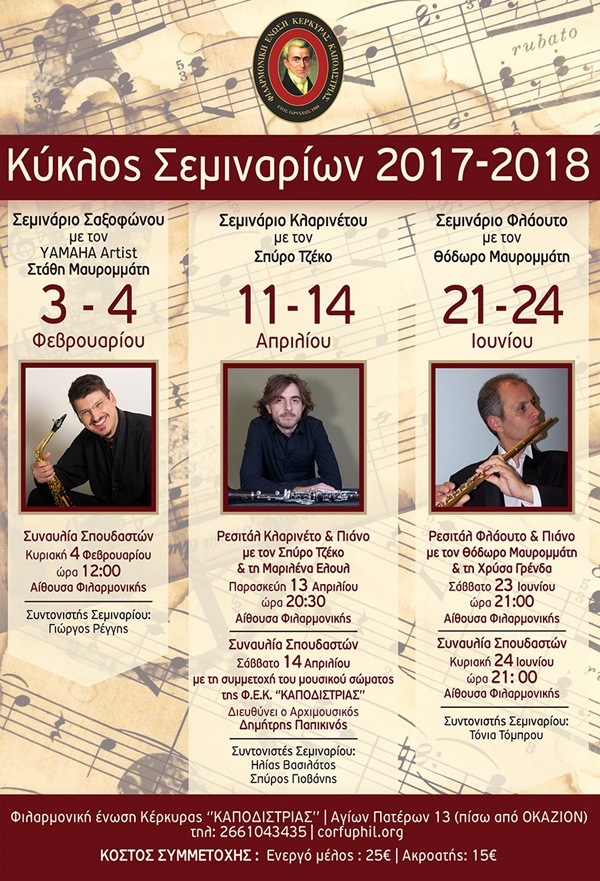 Η Φιλαρμονική Ένωση Κέρκυρας “Καποδίστριας” διοργανώνει κύκλο εκπαιδευτικών σεμιναρίων για το ακαδημαϊκό έτος 2017-2018, που απευθύνονται στους μουσικούς όλων των σχολών, των φιλαρμονικών, των ωδείων και των μουσικών σχολείων.