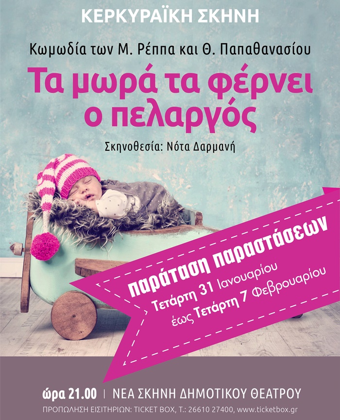 Η Κερκυραϊκή Σκηνή μετά την πολύ θερμή ανταπόκριση του κοινού παρατείνει τις ημέρες των παραστάσεων του έργου των Μ. Ρέππα και Θ. Παπαθανασίου «Τα μωρά τα φέρνει ο πελαργός», από την Τετάρτη 31 Ιανουαρίου έως και την Τετάρτη 7 Φεβρουαρίου στη Νέα Σκηνή του Δημοτικού Θεάτρου στις 21:00.