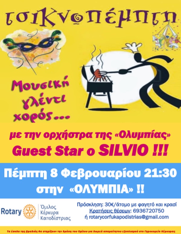 Ο Ροταριανός Όμιλος “Κέρκυρα-Καποδίστριας” διοργανώνει την Τσικνοπέμπτη (8 Φεβρουαρίου) μουσική βραδιά στο εστιατόριο Ολυμπία για να περάσουμε καλά ενισχύοντας ταυτόχρονα το πρόγραμμα του Ομίλου για δωρεά απαραίτητου εξοπλισμού στο Γηροκομείο Κέρκυρας.