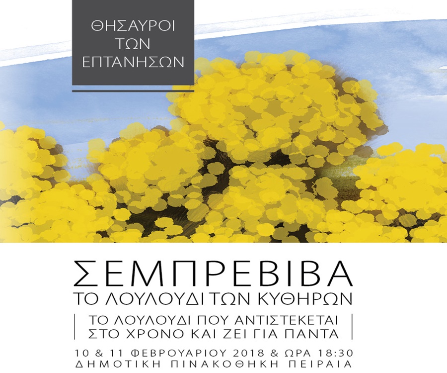 Η ΙΟΝΙΟΣ Βιβλιοθήκη της ΕΝΩΣΗΣ ΕΠΤΑΝΗΣΙΩΝ ΕΛΛΑΔΑΣ, στο πλαίσιο της θεματικής σειράς «Θησαυροί των Επτανήσων», διοργανώνει ποικίλες εκδηλώσεις αφιερωμένες στο αιώνιο άνθος, την «Σεμπρεβίβα - το λουλούδι των Κυθήρων», οι οποίες θα πραγματοποιηθούν το Σάββατο 10 & την Κυριακή 11 Φεβρουαρίου και ώρα 18:30 στη Δημοτική Πινακοθήκη Πειραιά.