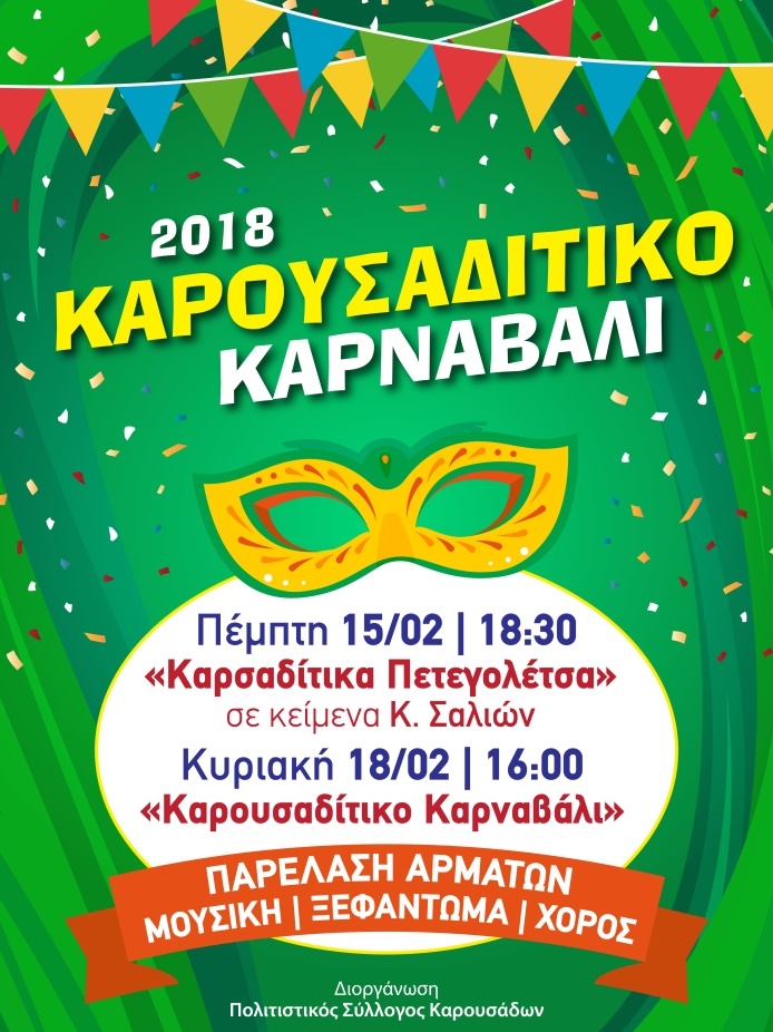 Ο Πολιτιστικός Σύλλογος Καρουσάδων διοργανώνει αποκριάτικες εκδηλώσεις που θα πραγματοποιηθούν στο πλαίσιο του Καρουσαδίτικου Καρναβαλιού 2018.