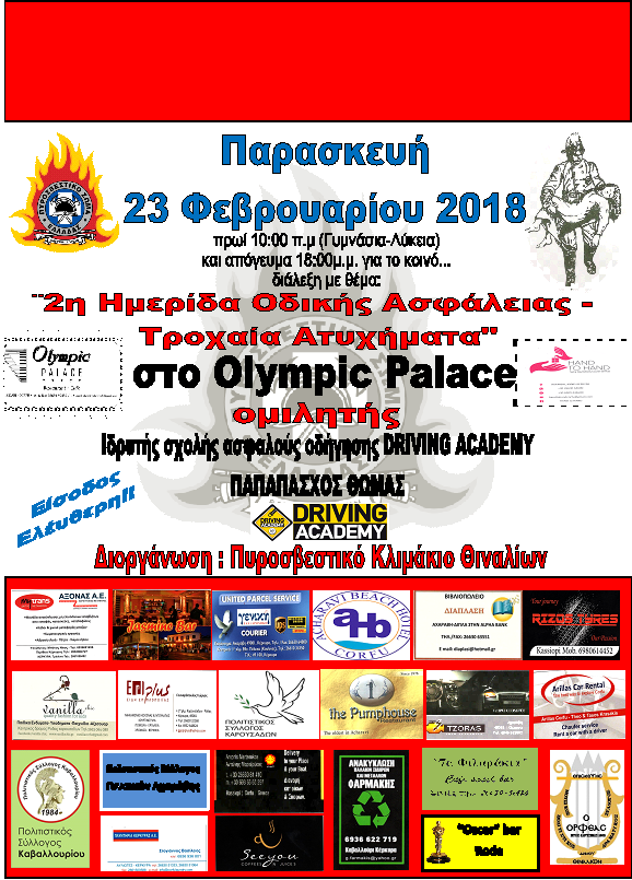 Την Παρασκευή 23/2/18 και Ω/18:00 η Διοίκηση Πυροσβεστικών Υπηρεσιών Νομού Κέρκυρας, με έδρα το Πυροσβεστικό Κλιμάκιο Θιναλίων, σε συνεργασία με τη Σχολή Ασφαλούς Οδήγησης «DRIVING ACADEMY» θα πραγματοποιήσει την 2η ημερίδα οδικής ασφάλειας – τροχαία ατυχήματα στο ξενοδοχείο «Olympic Palace» στο Σιδάρι, Δ.Ε. Εσπερίων Δήμου Κέρκυρας. Κεντρικός ομιλητής ο κος Παπαπάσχος Θωμάς (ιδρυτής – εκπαιδευτής σχολής) θα μιλήσει για τους κινδύνους και τους πρακτικούς τρόπους μείωσης του ρίσκου ατυχημάτων στην οδήγηση.