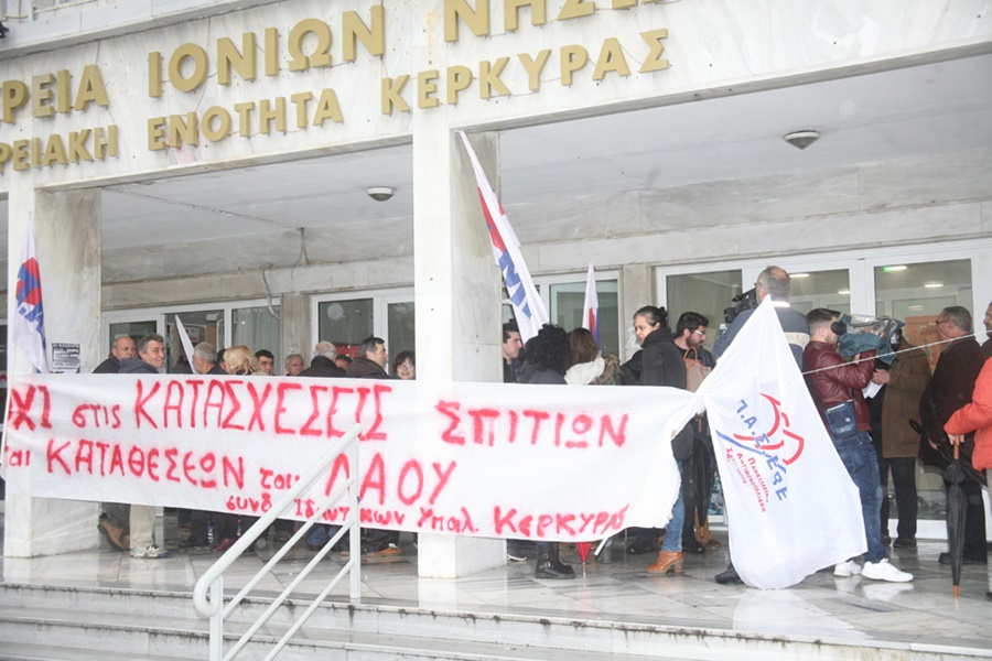 Τα σωματεία που συσπειρώνονται στο ΠΑΜΕ πραγματοποίησαν την Τετάρτη, δυναμική παράσταση διαμαρτυρίας στη ΔΟΥ Κέρκυρας ενάντια σε κατασχέσεις λογαριασμών και κατοικιών λαϊκών νοικοκυριών.
