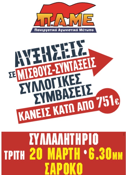 Με σύνθημα “δυναμώνουμε τον αγώνα για ΣΣΕ με αυξήσεις, για επαναφορά της ΕΓΣΣΕ και του κατώτερου μισθού στα 751 ευρώ, για την κατάργηση όλων των αντεργατικών νόμων που υπονομεύουν τις ΣΣΕ” καλεί το ΠΑΜΕ σε συλλαλητήριο την Τρίτη, στις 6.30, στο Σαρόκο.
