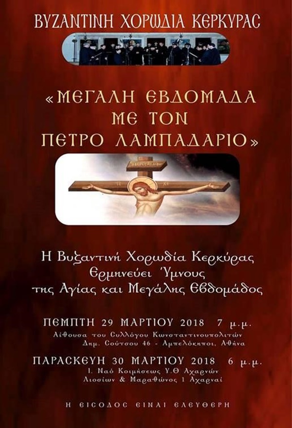 Η Βυζαντινή Χορωδία Κερκύρας προσκεκλημένη από το «Σύλλογο φίλων Βυζαντινής Μουσικής», το «Σύλλογο Ελλήνων υπηκόων απελαθέντων εκ Τουρκίας» & την Ενορία Κοιμήσεως Υ. Θεοτόκου Αχαρνών, θα δώσει δύο Συναυλίες με ύμνους της Μεγάλης Εβδομάδος.