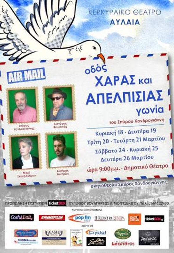 Αρχή λοιπόν με το έργο «ΟΔΟΣ ΧΑΡΑΣ ΚΑΙ ΑΠΕΛΠΙΣΙΑΣ ΓΩΝΙΑ»του συμπατριώτη μας Σπύρου Χονδρογιάννη, με επόμενες παραστάσεις στις 20, 21 και 24, 25, 26 Μαρτίου στο Δημοτικό Θέατρο Κέρκυρας (Νέα Σκηνή) στις 21:00.
