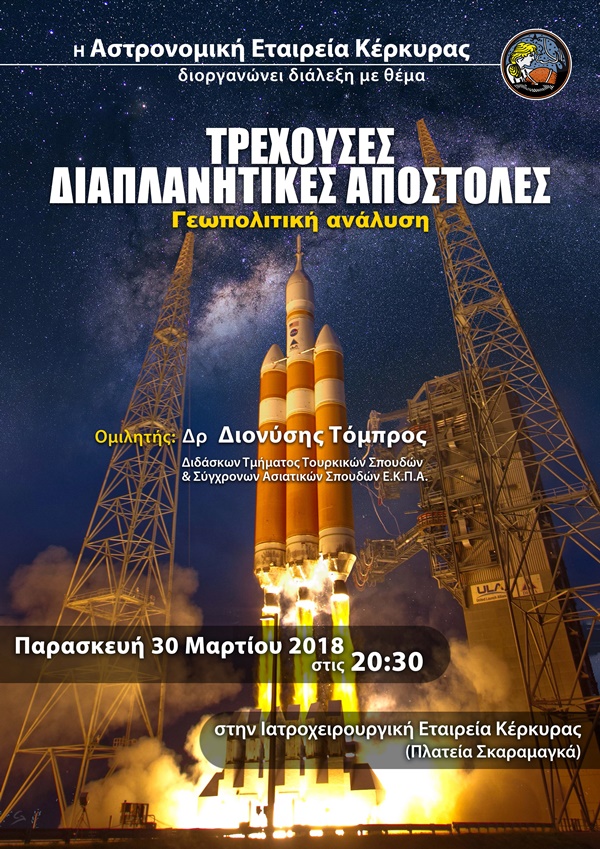 Η Αστρονομική Εταιρεία Κέρκυρας διοργανώνει διάλεξη με θέμα: ΤΡΕΧΟΥΣΕΣ ΔΙΑΠΛΑΝΗΤΙΚΕΣ ΑΠΟΣΤΟΛΕΣ – Γεωπολιτική ανάλυση.
