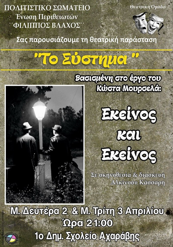 Η θεατρική ομάδα της Ένωσης Περιθειωτών "Φίλιππος Βλάχος" διοργανώνει την θεατρική παράσταση "Το Σύστημα", βασισμένη στο έργο του Κώστα Μουρσελά "Εκείνος και Εκείνος", σε σκηνοθεσία και διασκευή Αλκίνοου Κάσσαρη.