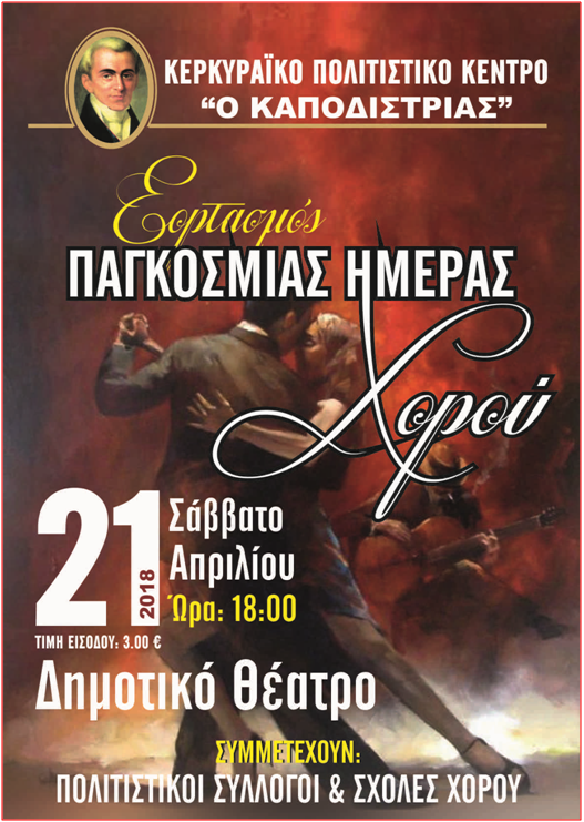 Στις 21 Απριλίου το Πολιτιστικό Κέντρο «Ο Καποδίστριας» θα συμμετάσχει για 18η συνεχή χρονιά στην επέτειο για τον εορτασμό της Παγκόσμιας Ημέρας Χορού και θα διοργανώσει χορευτική παράσταση στο Δημοτικό Θέατρο της Κέρκυρας.