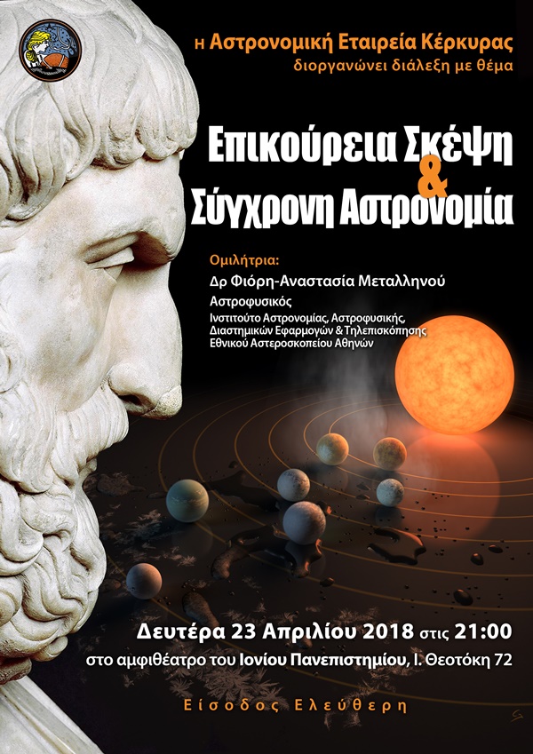 Η Αστρονομική Εταιρεία Κέρκυρας διοργανώνει διάλεξη με θέμα: ΕΠΙΚΟΥΡΕΙΑ ΣΚΕΨΗ & ΣΥΓΧΡΟΝΗ ΑΣΤΡΟΝΟΜΙΑ.