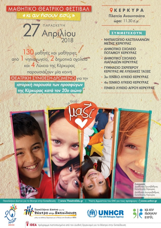 Το Πανελλήνιο Δίκτυο για το Θέατρο στην Εκπαίδευση σε συνεργασία με την Ύπατη Αρμοστεία του ΟΗΕ για τους Πρόσφυγες διοργανώνει Θεατρικό Φεστιβάλ-Ημέρα Δράσης την Παρασκευή 27 Απρίλιου 2018,ώρα 11.30 π.μ., στην πλατεία Ανουντσιάτα (πεζόδρομος Ευγενίου Βουλγάρεως) στη Κέρκυρα.